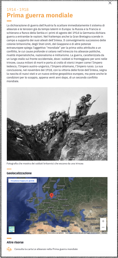 Per ciascuna data trovi una scheda descrittiva che racconta l'avvenimento. Le schede sono arricchite di immagini e geolocalizzazioni per connettere le dimensioni di tempo e spazio. Inoltre, vengono spesso proposti ulteriori contenuti multimediali per l'approfondimento, come video e la cartografia interattiva dell'atlante digitale HUB Maps.