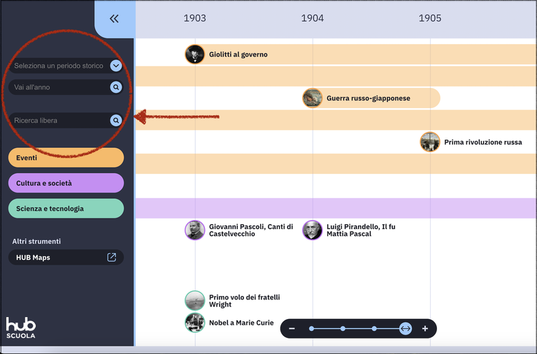 Lo strumento zoom ti offre la possibilità di ingrandire o ridurre il livello di dettaglio. L'Homepage propone una visione d’insieme da cui puoi constatare la densità degli avvenimenti nei secoli; aumentando il livello di zoom puoi visualizzare gli eventi per periodo o anno per anno.